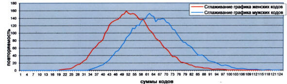 На графике «СД-модель Л. Болотовой» по оси абсцисс запечатлены коды современных имён-отчеств россиян в оцифровке по системе Александра Киселя [22]. По оси ординат повторяемость кодов в соответствии со справочником имён Бориса Хигира [46]. График расположен в диапазоне до 118, пересечение женской и мужской структур происходит в точке 59.