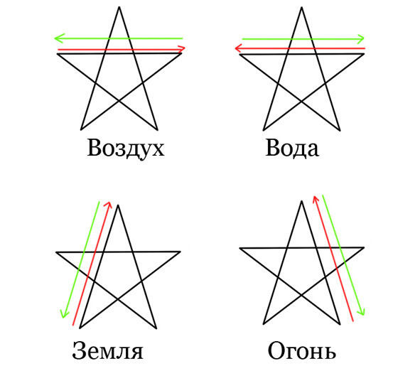 На практике это выглядит чуть сложнее за счет того, что движение от Воздуха и движение к Воде, предназначенные для изгнания Воздуха и призыва Воды соответственно, выглядят совершенно одинаково. Но это не проблема, поскольку окончательное значение символа задает ваше намерение, Воля и цель, с которой выполняется ритуал. Сам ритуал будет описан ниже, а вам пока необходимо разобраться с сутью вызывающих и изгоняющий Пентаграмм (часто так же называемых активными и пассивными).