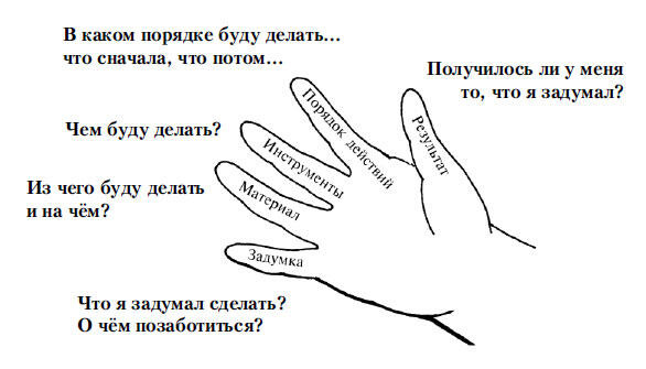 Деятельность осознаётся человеком как взаимосвязь пяти компонентов: замысел + материал + инструменты + преобразующие действия + результат. Эту модель[6] выстраивает воспитатель, поэтапно предлагая ребёнку следующие вопросы:
