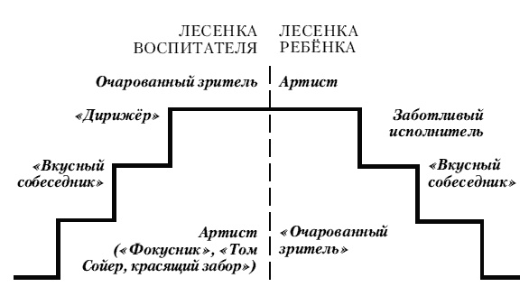 Характер педагогических усилий я образно представляю через так называемую «Лесенку успеха», на «ступеньках» которой каждый раз взрослый выступает перед ребёнком в новой роли относительно каждого вида осваиваемой деятельности. То он «фокусник» (или «Том Сойер, который красит забор») на первой «ступеньке», то «вкусный собеседник» на второй, то «дирижёр» на третьей, то «очарованный зритель» на четвёртой.