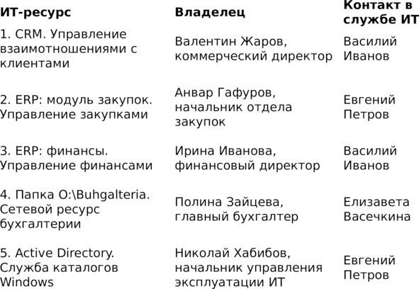 Подготовьте сводный перечень ИТ-ресурсов и их владельцев. Подойдет таблица в Excel со следующими полями: