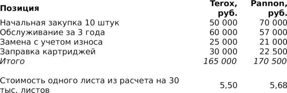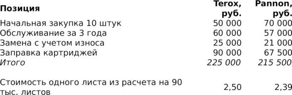 Компания Pannon. Принтеры стоят 7000 руб./шт., сервисное обслуживание 1900 руб./год. Каждые три года в среднем приходится менять 30% устройств. Картридж рассчитан на 800 листов при стоимости заправки 600 руб.