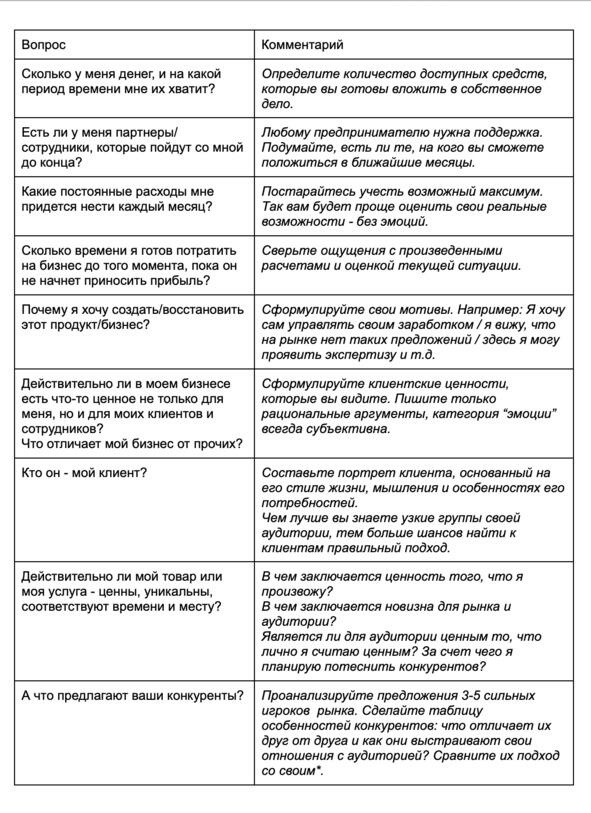 После того, как вы ответили на все вопросы, не спешите переходить к следующему блоку. Дайте себе время, оцените ваши аргументы с позиции дотошного критика. Спросите себя: «действительно ли все те ресурсы, что я имею сегодня, и те идеи, которые есть у меня сейчас, позволят мне создать/спасти бизнес в текущих реалиях?»