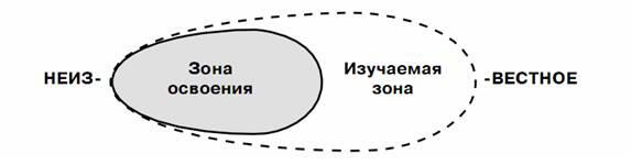 На всякий случай сразу оговоримся, что изучение не только не заканчивается с началом освоения, но, напротив, именно широкое включение людьми в свою повседневную деятельность результатов открытий учёных позволяет собирать новые данные, дополняющие и уточняющие лабораторные наблюдения. Что, в свою очередь, позволяет эффективно модифицировать имеющиеся и разрабатывать новые материалы, механизмы, приборы и т. д. Так что наименование изучаемая зона на схеме 1, конечно же, относится ко всему большему эллипсоиду, а не только к разнице между ним и малым (зона освоения) эллипсоидом.