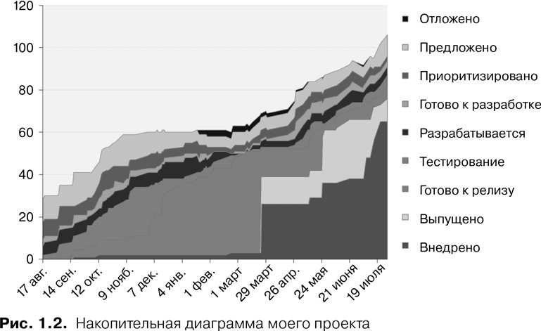 Циклы обратной связи на основе метрикГрафик на рис. 1.2 это моя накопительная диаграмма потока (cumulative flow diagram CFD). Я сделал ее следующим образом: