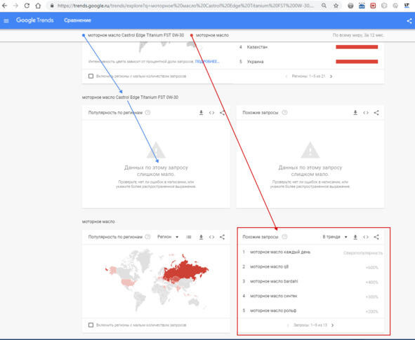 Как видно из скриншота «моторное масло Castrol Edge Titanium FST 0W-30», имеет мало запросов, и никаких дополнительных слов.