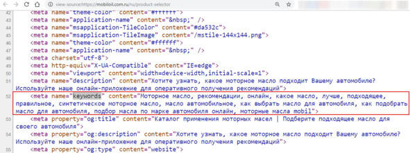 Для примера набираем в Google «моторное масло», далее открываем первый десяток сайтов. На странице сайта кликаем правой кнопкой мыши, и в раскрытом меню выбираем пункт «Просмотр кода страницы».