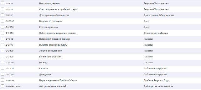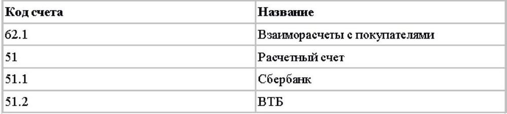 Пример кусочка плана счетов. Нумерация на западный манер.