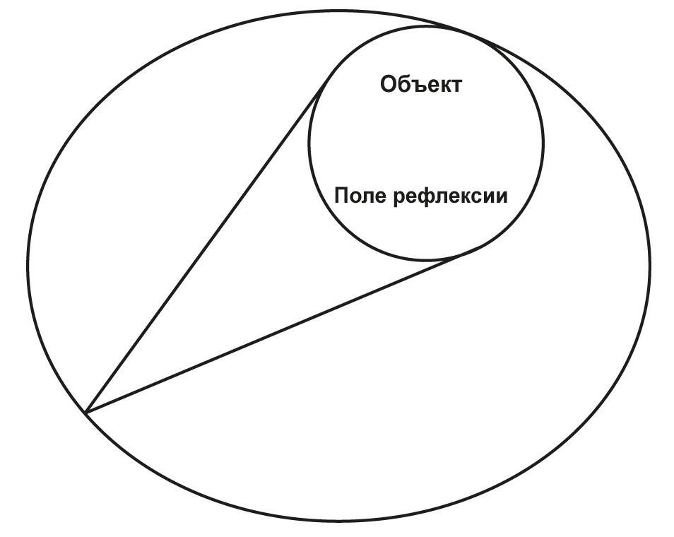 Рисунок демонстрирует сосредоточенность поля рефлексии на объекте исследования. Цель познания в свете классического идеала рациональности построение истинной, объективной картины реальности; описание вещей такими, каковы они есть «на самом деле». Становящиеся науки на данном этапе решают проблемы строгого определения границ собственного предмета и поисков объективного метода исследования. Приоритет отдается опытному и экспериментальному знанию, теории строятся на фактологической основе. Согласно исследовательским установкам научного сообщества, к теории ведет правильный метод, а достижение достоверности, объективности, валидности исследования требует элиминации случайных помех и субъективных факторов.