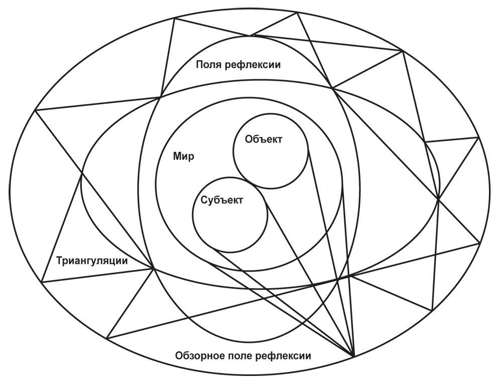 Рисунок демонстрирует свободу в выборе установочного ракурса: концентрация ли непосредственно на объекте (в соответствии с идеалом классической рациональности), на взаимодействии ли объекта и субъекта, или на взаимоотношениях объекта и субъекта, представленных в разнообразии систем (в соответствии с идеалом неклассической рациональности). Помимо этого здесь добавились, с одной стороны, множественные поля рефлексии, а с другой обзорное поле рефлексии, где осуществляется произвольное конструирование картины мира на основе разных исследовательских ракурсов. Среди интегрирующих исследовательских стратегий наряду с вышеупомянутыми возможны: «триангуляция» (как чередующаяся смена методологической оптики) и «смешанные методы» (смена исследовательской оптики и скольжение мысленным взглядом от одного познавательного ракурса к другому). Сочетание ракурсов создает новые, избыточные, иногда неожиданные и ранее не очевидные возможности. Наиболее проблематичной и одновременно креативной областью становится обзорное поле рефлексии, где решаются задачи синтеза и интеграции исследовательских стратегий.