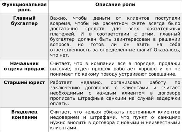 Компания занимается дистрибьюцией сельскохозяйственных удобрений и семян. Планы по продажам выполняются и перевыполняются, продавцы получают бонусы, а вот оборотных средств в компании не хватает, так как за поставленный товар клиенты не всегда рассчитываются вовремя. Для оплаты налогов и зарплаты, деньги приходилось собирать и выпрашивать у клиентов. Владельца эта ситуация не устраивала, и он решил обратиться к нам. Мы пообщались с каждым из стейкхолдеров и выяснили позицию, интересы и степень вовлеченности в решение проблемы. И в ходе ролевой игры решили собрать на совещание всех заинтересованных в данной ситуации лиц, чтобы выработать решения. На совещании будут присутствовать: главный бухгалтер, начальник отдела продаж, старший юрист компании и владелец. Задача для всех: выработать решение ситуации, которое бы устраивало всех. Но функциональные роли в симуляции, будут отличатся от их ролей в компании, то есть бухгалтер станет юристом, а юрист возглавит отдел продаж. Таким образом, мы их «переобуем в тапочки другого отдела».