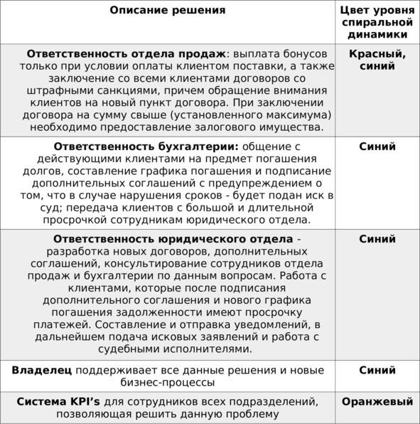 У нас в тоже время должен быть вариант идеального решения, он не так прост, как кажется на первый взгляд и очень зависит от уровня спиральной динамики, на котором находится корпоративная культура компании (автор теории Грейвз Клер Уильям, рекомендую почитать Фредерика Лалу http://biryuzovie.ru/stati/frederik-lalu-opisyvaya-organizacii-budushhego). Если принимать решения с точки зрения красного уровня: нужно выбивать деньги из клиентов, можно лишать бонуса продавцов, чьи клиенты не рассчитались, на синем можно подавать иски в суд и так далее. Принятие решений таким образом в будущем грозит нам: потерей мотивации продавцов, потерей части клиентов и судебными издержками. Поэтому решение должно быть многоуровневое с разделением ответственности между всеми подразделениями компании: