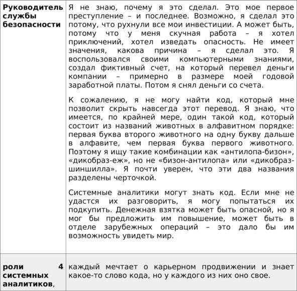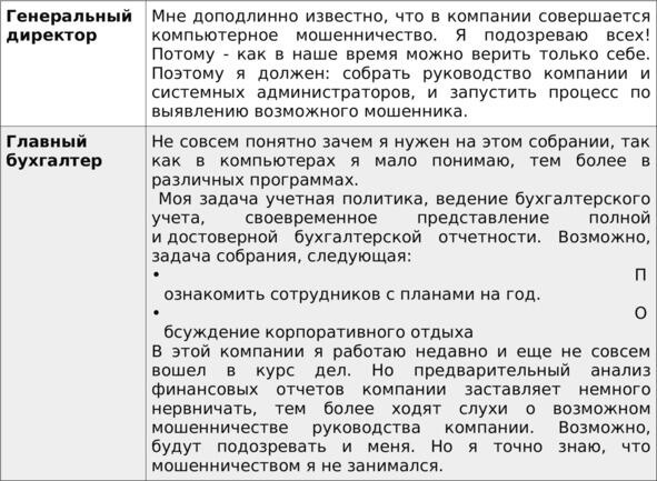 Процесс: 7 человек вовлекаются в собрание продолжительностью 40 минут, системных аналитиков чаще всего решают приглашать по одному и Руководитель СБ медленно, но уверено выведывает все части кода, для того чтобы скрыть факт мошенничества. Я использую эту игру 12 лет и всегда все проходит по одному и тому же сценарию, никто не подозревает Руководителя СБ и он достигает своих целей. Если у меня есть ассистент, то я прошу его вне пределов аудитории поставить камеру на штатив и записать после окончания симуляции 30 секундные интервью с каждым участником с ответами на два вопроса:
