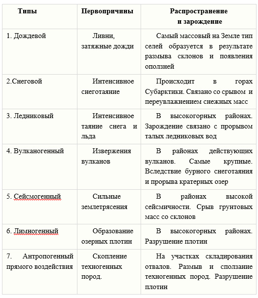 На основе главных факторов возникновения сели классифицируются следующим образом: зонального проявления главным фактором формирования являются климатические условия (осадки). Носят они зональный характер. Сход происходит систематически. Пути движения относительно постоянны; регионального проявления (главный фактор формирования геологические процессы). Сход происходит эпизодически, и пути движения непостоянны; антропогенные это результат хозяйственной деятельности человека. Происходят там, где наибольшая нагрузка на горный ландшафт. Образуются новые селевые бассейны. Сход эпизодический.