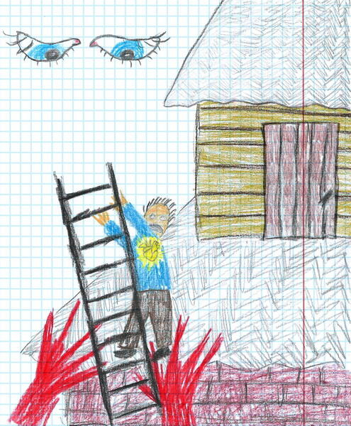 Владимир явно не ожидал увидеть ничего подобного на рисунке был изображен он сам на крыше дома с деревянной лестницей в руках, а снизу к нему тянулись непропорционально большие и длинные руки красного цвета. А в углу рисунка были нарисованы большие человеческие глаза, словно наблюдающие за всем этим. Причем нарисовано всё это было довольно узнаваемо.