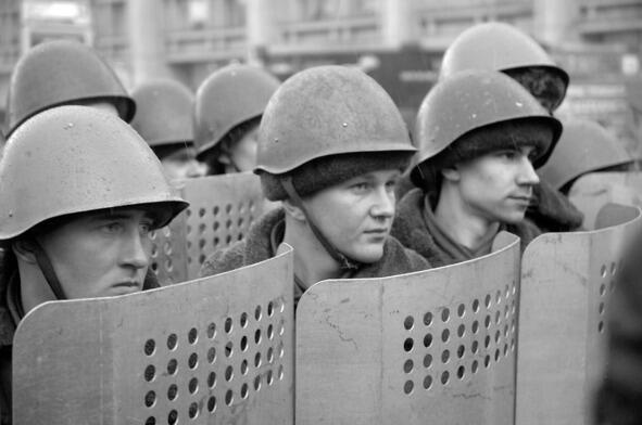 Час ночи В запасной студии РТР какая-то сплошная «Будка гласности». Репортажи: Смоктуновский на баррикадах, римские щиты ОМОНовцев.