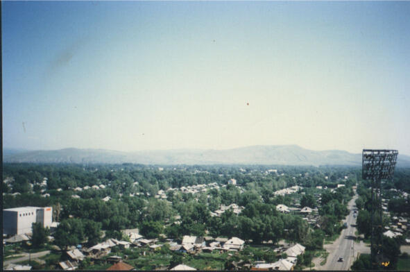 Днём Игорь уехал по своим делам, а мы отправились в город. Сначала мы зашли на вокзал переписать расписание, а также отправить телеграммы домой. Затем на базаре я купил себе кепку (чтобы энцефалитные клещи, якобы здесь живущие, и со всех веток сыплющиеся, не поселились у меня на голове), и мы пошли бродить по городу. Огромный, совершенно пустой стадион, которым уже давно никто не пользовался, обозначался двумя большими осветительными вышками, торчащими над всем городом. Мы легко пролезли на одну из этих вышек, и поднявшись наверх, смотрели и фотографировали город.