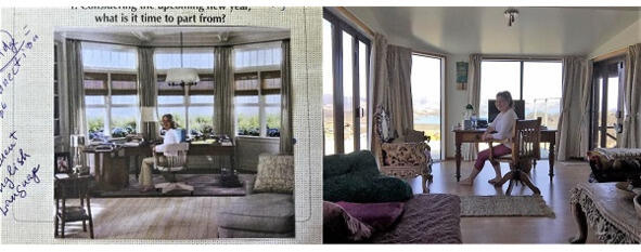 В мае 2019 года я перебирала старые дневники, и обнаружила старые записи с вдохновляющими картинками. Одна из них рабочий кабинет моей мечты. Тогда, три года назад, я нашла в интернете и распечатала эту фотографию из фильма «Любовь по правилам и без». На фото героиня фильма, известная писательница, которая пишет книги в своём рабочем кабинете с видом на океан. На картинке антураж, почти идентичный тому, что окружает меня с апреля 2019 года. В доказательство этого я сделала фото своего рабочего процесса прямо сейчас, завершая процесс работы над книгой. Сравните эти две фотографии. Признаюсь, я даже ощутила мурашки по всему телу. Насколько сильна оказалась визуализация. До деталей. В ежедневник «Points of You» я не заглядывала больше двух лет, и про эту вдохновляющую фотографию совершенно забыла. «Невероятно!» пронеслось в мозгу, когда я открыла ежедневник на страничке со вклеенной картинкой. Она для меня очень глубоко эмоционально откликалась не только визуально. Сам фильм когда-то очень запал в душу. Я могла бы сделать сходство более явным, передвинув коврик и кое-что из мебели. Но даже в таком виде совпадение кажется почти мистическим. Хотя никакой мистики нет. Дальше в книге я всю эту мистику проанализирую и объясню с позиции логики.