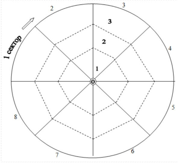 Покажите ребенку круг, разделенный на 8 частей. Предложите ответить на вопросы, закрашивая одну, две или три части сектора. Закрашиваются все 3 части, если ребенок ответил правильно; 2 части, если сделал 12 ошибки; 1 часть, если сделал 34 ошибки; и не закрашивается ничего, если не знает ответа.