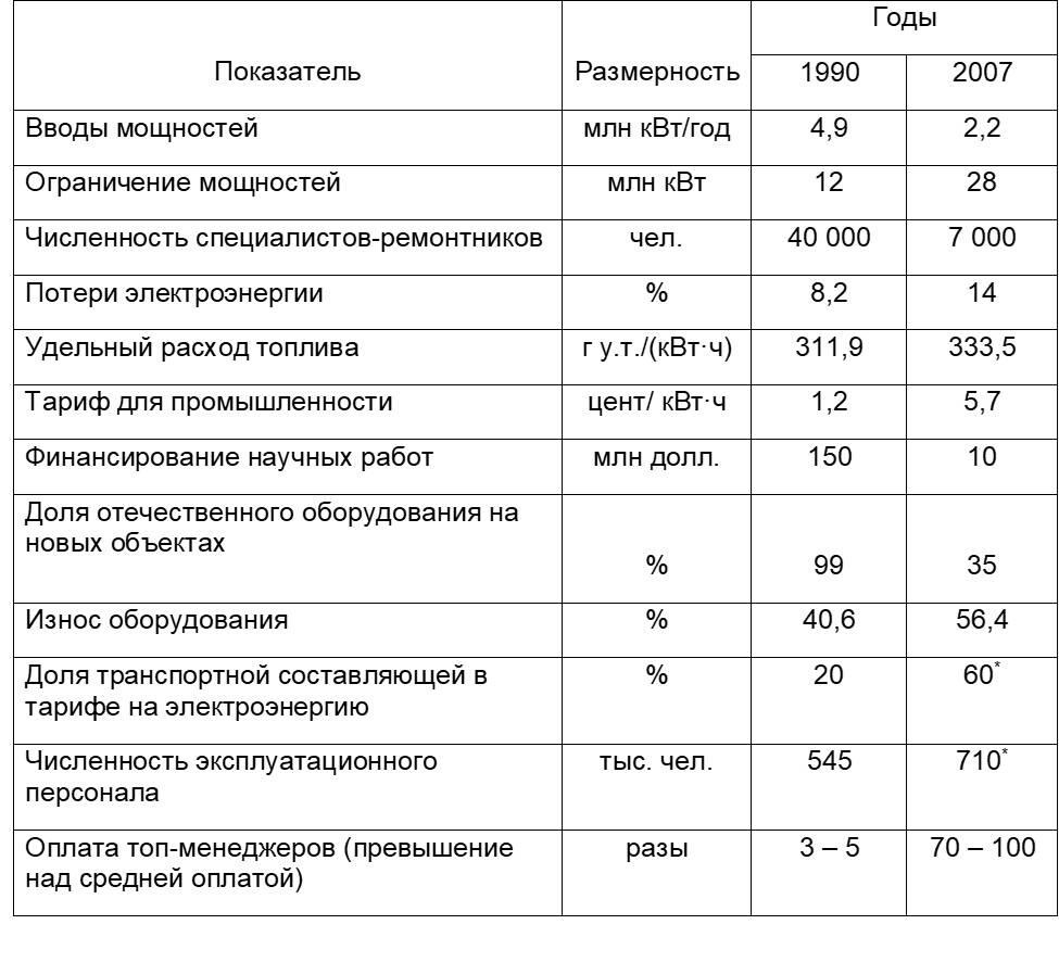 Резко сократилось количество ремонтного персонала. Не ремонтировались около 8 млн кВт мощностей станций в год. Доля отечественного оборудования на новых энергетических объектах упала с 99 до 35 %. Энергомашиностроительная отрасль переживала глубокий кризис. В результате сокращения финансирования научно-исследовательских и опытно-конструкторских работ в 15 раз было потеряно более 10 лет для развития передовых технологий. В то же время оплата топ-менеджеров возросла в десятки раз (табл. 2).