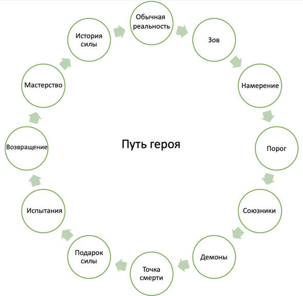 Джозеф Кэмпбелл в книге «Тысячеликий герой» проанализировал известные мифы древности и пришёл к выводу, что все они имеют одинаковую структуру «путь героя», который включает в себя семнадцать шагов. Обычно его упрощают до двенадцати.