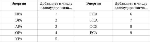 Духовная детонация (энерго-взрыв) происходит тогда, когда сумма соответствующих словам букв, приведённая к общему знаменателю, равна 9 либо 10 (духовный «0»). Когда эта сумма меньше, тогда энерговзрыв при произнесении данного слова может произойти при наличии в окружающем пространстве энергии, соответствующей недостающему до «энергодетонации» числу.