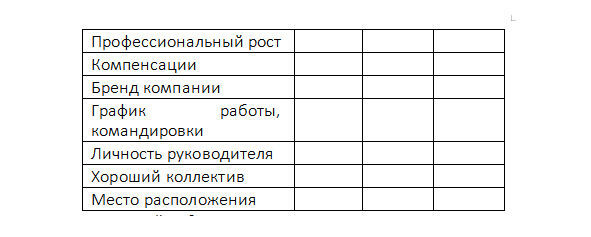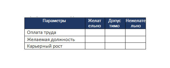 В данной таблице даны только примеры параметров, которые Вы можете отметить для себя как значимые. Вы можете не принимать их во внимание, если они не имеют для Вас значения, и написать то, что важно именно для Вас. Эта таблица поможет понять, какие из важных для Вас параметров присутствуют на текущем месте работы и на что обращать внимание при рассмотрении других предложений и вариантов.