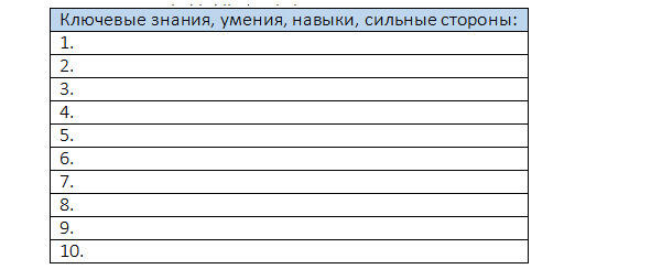 Теперь выпишите 1015 ключевых знаний, умений и навыков, а также сильных сторон, которые Вы выявили из предыдущих упражнений.