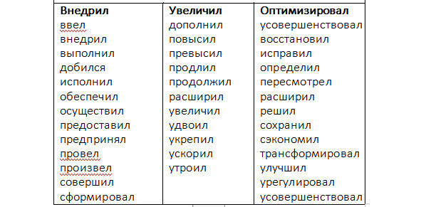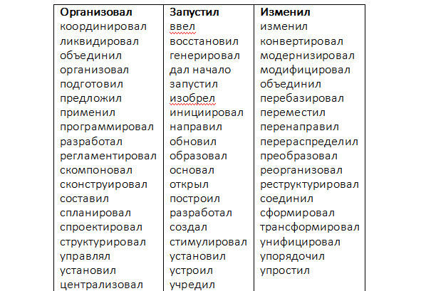 В примерах достижений используются активные слова в прошедшем времени, что помогает подчеркнуть проявленные умения и конкретный достигнутый результат. Внизу приведен список активных слов-синонимов, который может Вам пригодиться: