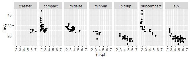 Чтобы собрать свой график из нескольких фрагментов от одной одной переменной, используйте facet_wrap(). Первым аргументом функции facet_wrap() должна быть именем структуры данных в R, которое начинается с символа «~», за которым следует имя переменной. Переменная, передаваемая в функцию facet_wrap(), должна быть дискретной. Например, следующая команда: