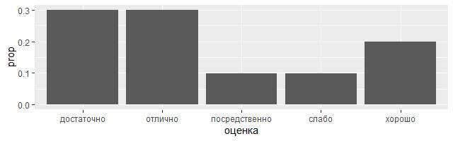 geom_bar (mapping = aes (x = оценка, y = stat (prop), group = 1))