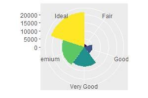 Функция coord_polar() переключает графопостроитель в режим полярных координат. Полярный координаты позволяют визуализировать интересную связь между линейчатой и круговой диаграммами. Напоследок вернёмся к тому, с чего начинали, алмазам и их популярности в зависимости от качества. В следующем примере переменная bar заполняется вызовом процедуры формирования блоков данных для изображения. Далее, диаграмма транспонируется, тем самым приводя к линейчатому виду, и изображается в полярной системе координат отдельно: