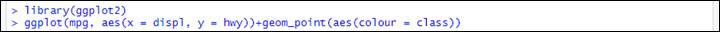 ggplot(mpg, aes(x = displ, y = hwy))+geom_point(aes(colour = class))