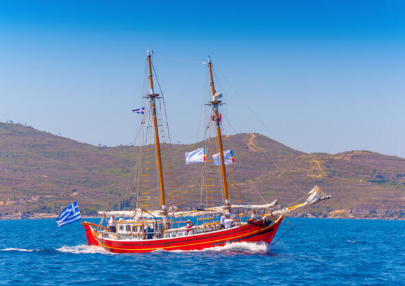 Агата Кристи, «Десять негритят»Большой двухмачтовый баркас с высокими бортами, выкрашенными в ярко-красный цвет, на которых с обеих сторон его широких «скул» гордо красовалась надпись «Афина» на греческом языке, ранним утром медленно отошел от каменного причала Хоры Наксоса и, беспрепятственно развернувшись в пустой бухте по широкой дуге, уверенно взял курс на соседние острова.