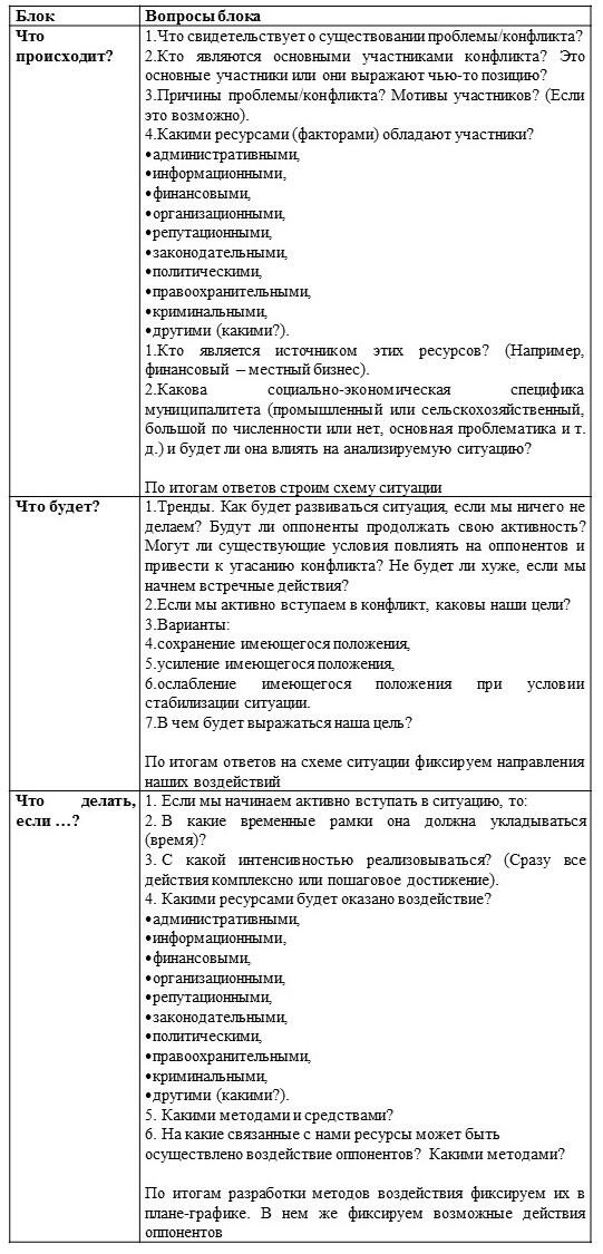 Для того, чтобы более четко выстраивать модели ситуаций, разрабатывать сценарии и методы воздействия, мы сформулировали ориентировочный список вопросов, которые аналитик задает относительно конкретной ситуации, и набор стандартных элементов, на основе которых конструируются ответы. Общий список вопросов представлен в таблице 2.1. Однако естественно предположить, что в каждой конкретной ситуации он может быть расширен. Вопрос в том, какой уровень детализации будет необходим.
