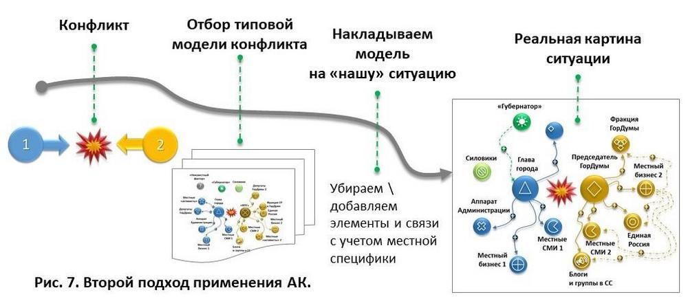 По сути, дается конфликтная ситуация, которая анализируется с помощью стандартных элементов АК. В зависимости о специфики конфликта и сценарных задач формируются прогнозы развития, на основе которых разрабатывается сценарий действий.