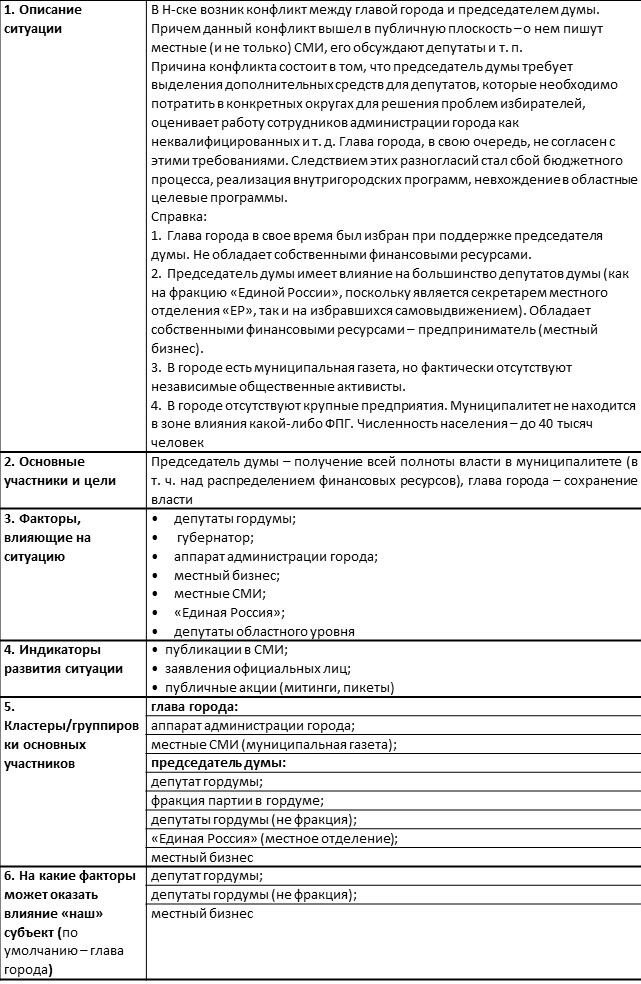 * Безусловно, когда речь идет о справке по конкретной ситуации, то подразделы 3, 5, 6 могут и должны наполняться персональной информацией, источниками которой могут стать официальные сайты местного избиркома (данные о депутатах и участниках выборов), администрации и думы муниципалитета, публикации в СМИ и т. п. Но в нашем случае полученная модель ситуации позволяет определить направленность поиска этих данных.
