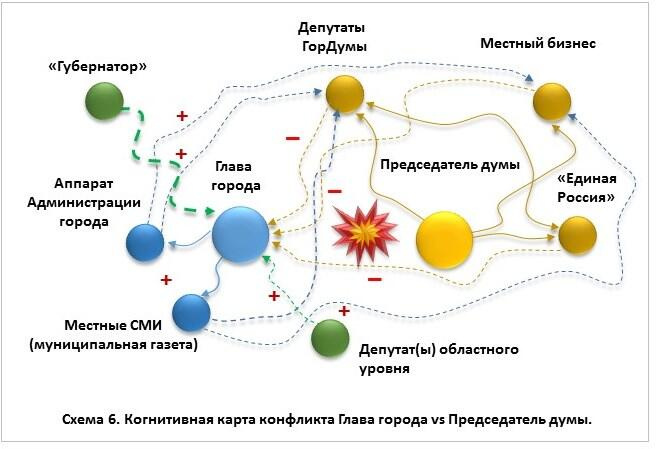 По итогам нашего анализа мы смогли построить когнитивную карту, которая достаточно полно отражает происходящий в Н-ске конфликт (см. схему 6).