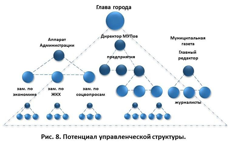 На Рис. 8. Выделены только основные элементы, которые Глава может использовать своей работе, начиная от Аппарата администрации, который так или иначе является операционным регулятором в сферах, за которые несет ответственность муниципалитет (см. Карточка «Администрация города. Полномочия.»), и заканчивая определением информационной политики муниципальной газеты, издающейся за счет местного бюджета.