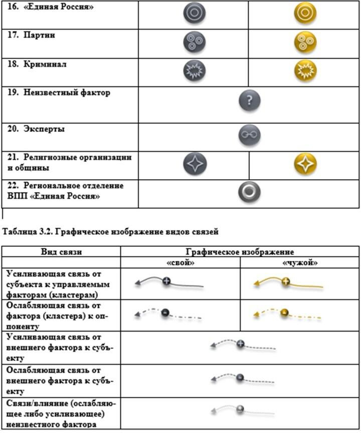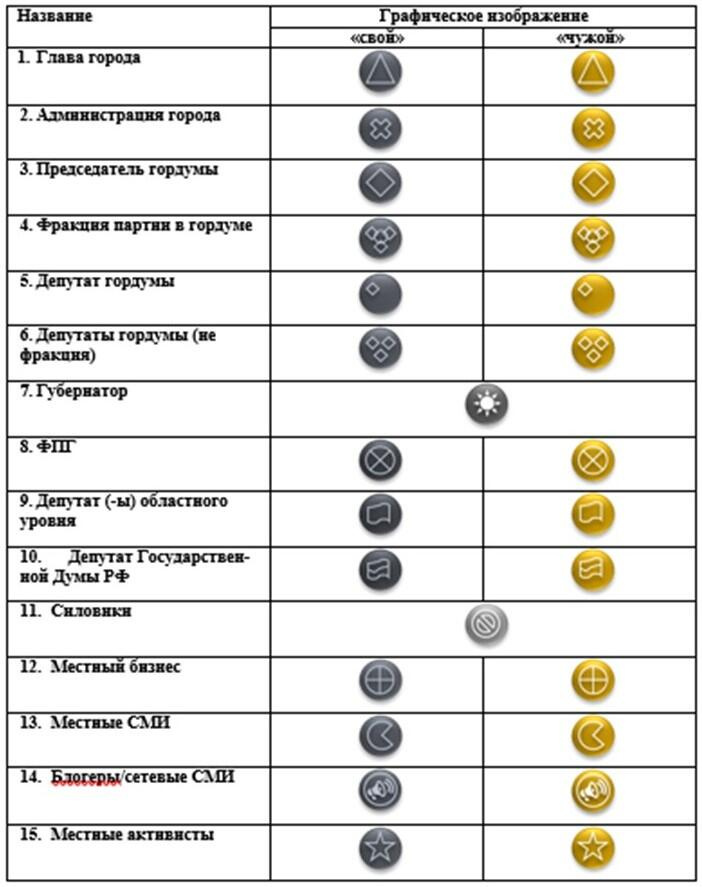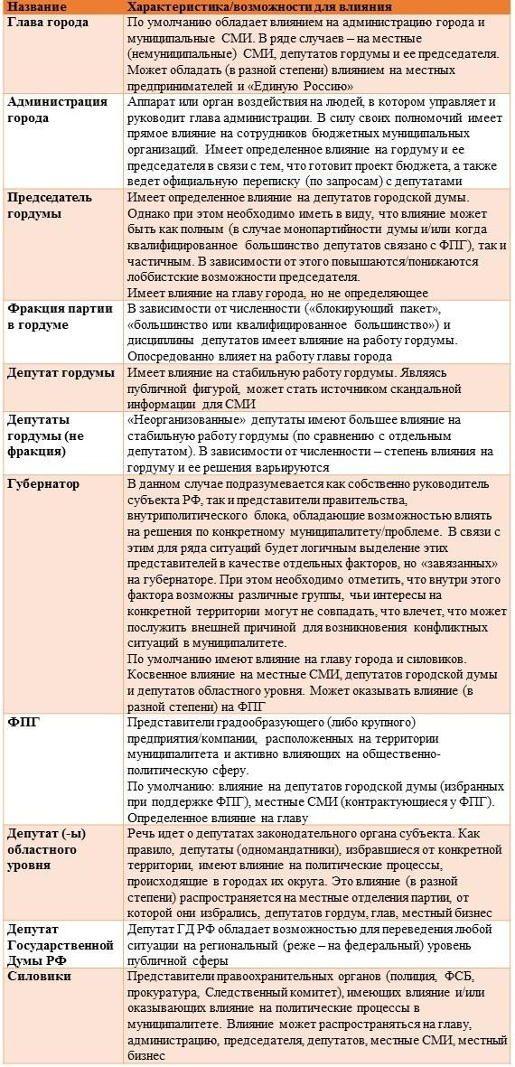 Более детальный анализ, собственно «карточки» основных субъектов конфликта вынесены в Приложение 1., где описаны не только их возможности («сила») и «болевые зоны», но и «правила», по которым они действуют.