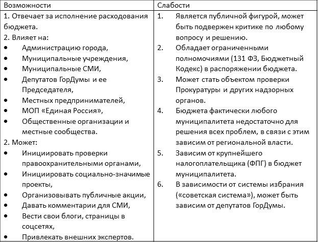 Разберемся по порядку. Карточка «Глава города» (ка и все остальные) включает в себя две колонки. В первой выделены основные обобщенные «возможности» (ресурсы), которые Глава может использовать для оказания влияния на своих оппонентов. Эти «возможности» обусловлены, с одной стороны, полномочиями, которые определены 131 ФЗ «Об общих принципах организации местного самоуправления в Российской Федерации», а с другой потенциалом, обладающим управленческой структурой муниципального органа власти (см. Рис. 8.).
