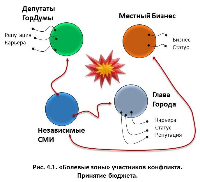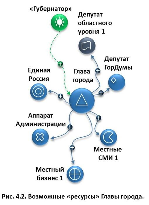 Однако здесь необходимо учитывать специфику уже не «любовных» отношений, а, особенности общественно-политической сферы в целом (и тех норм и правил, по которым она живет), с одной стороны, и то, что ресурсы участников таких ситуаций будут несколько иными с другой. Об этом речь пойдет ниже, сейчас же в качестве примера приведем возможные ресурсы Главы города, которые он может использовать для влияния на конфликт, связанный с принятием бюджета (см. Рис. 4.2.). При этом, еще раз повторимся, что «выявить» данные ресурсы и «болевые зоны» каждого участника публичных конфликтов, как правило, не представляет особого труда, используя только открытые источники информации (официальные сайты органов власти, публикации СМИ, материалы местных форумов и т. п.).