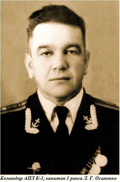 С 1 по 15 ноября 1959 года свой первый поход под лёд совершила и советская атомная подводная лодка К-3 под командованием Героя Советского Союза капитана 1 ранга Л.Г. Осипенко. Эта АПЛ была головным кораблём проекта 627 «Кит» (по классификации НАТО November), первой советской (третьей в мире) атомной субмариной, имела два атомных реактора и две линии вала. На вооружении АПЛ имела торпеды и мины. 17 января 1959 года подводная лодка Постановлением Совета Министров СССР передана в состав ВМФ СССР в опытовую эксплуатацию (приёмный акт подписан 17.12.1958 г.).