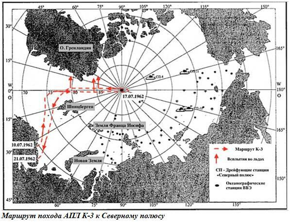 Погрузившись, направились в Норвежское море. 12 июля к концу суток была обнаружена неисправность циркуляционного насоса охлаждения главного конденсатора. Замену трех подшипников насоса производили в подводном положении. Ремонт продолжался около 14 часов. Далее маршрут к полюсу пролегал через Гренландское море по нулевому меридиану. 13 июля в 11 часов 30 минут АПЛ всплыла в Гренландском море для встречи с тральщиком с целью уточнения данных о ледовой обстановке и уточнения своего места. Однако из-за плохой погоды встреча состоялась только в 18:00. На следующие сутки в 10:45 на широте 79 градусов лодка в подводном положении вошла под кромку льда и двинулась по жёлобу Лены в Центральную Арктику, имея справа архипелаг Шпицберген, а слева Гренландию.