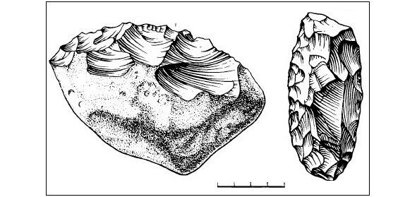 Рис. 2. Каменные орудия раннего палеолита, ашельская стадия 1.76 млн 150/120 тыс. лет назад (источник изображения Прасолов 1984: 112)