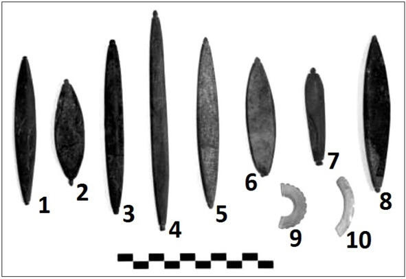 Рис. 20. Сланцевые грузила (1 8), фрагменты украшений (9, 10) (источник изображдения Гусенцова, Сорокин 2011: 445)