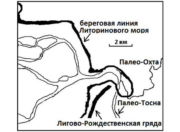 Рис. 18. Палео-Охта, Палео-Тосна, Лигово-Рождественская гряда и залив Литоринового моря (рисунок автора)