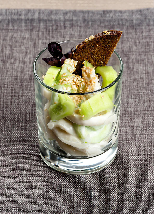 Очищенную тушку кальмара нарезаем кольцами толщиной 1 см, сбрызгиваем кунжутным маслом, солим, тщательно перемешиваем. Кальмары выкладываем на противень, закрытый пергаментом и готовим в разогретой заранее до 200°С духовке 35 минут. Охлаждаем до комнатной температуры.