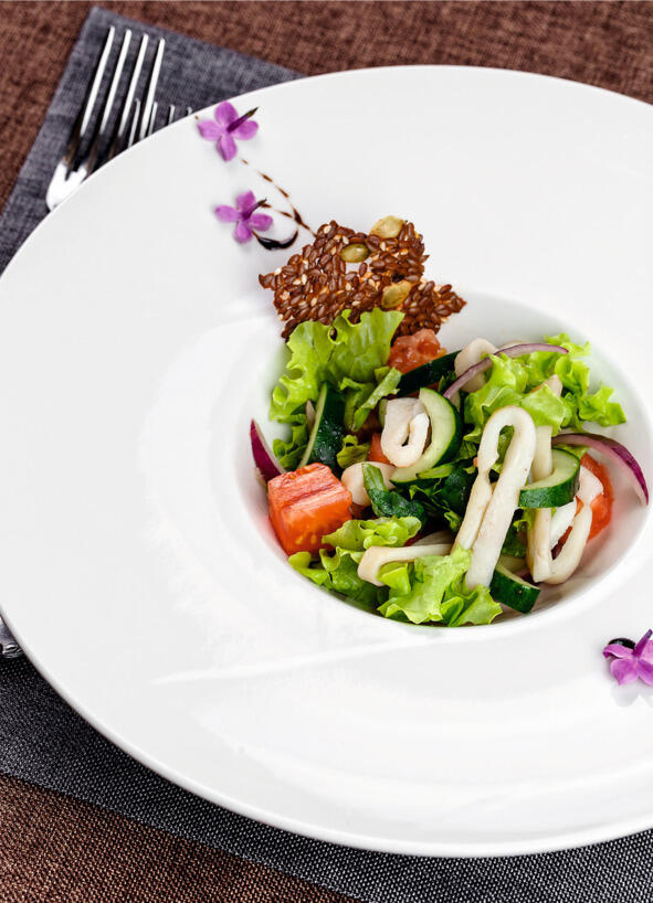 В тарелку выкладываем зелень салата или рукколу, нарезанные овощи, жареные кальмары, поливаем заправкой.