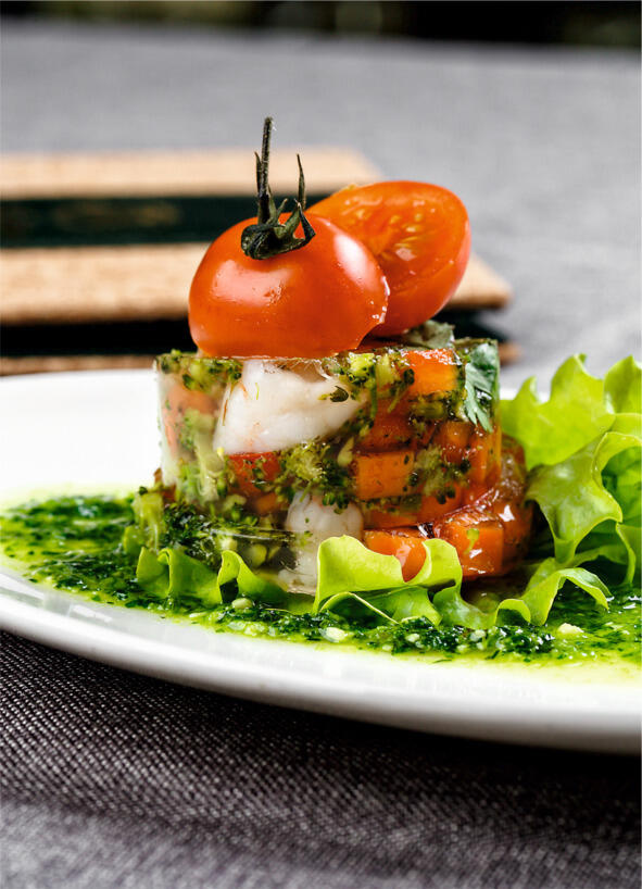 Желатин замачиваем в воде, даем набухнуть, добавляем сок лимона, нагреваем, не доводя до кипения, снимаем с огня. В силиконовую форму помещаем овощи, креветки, рубленую зелень и заливаем подготовленным раствором желатина с лимонным соком. Убираем в холодильник до полного застывания. После застывания желе аккуратно достаем из формы, выкладываем на тарелку, украшаем зеленью и половинками помидора черри.